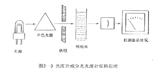 無論光度計,色度計或分光光度計,基本結構原理都是類似的。它們由光源,單色器,狹縫,吸收杯和檢測器系統組成。
